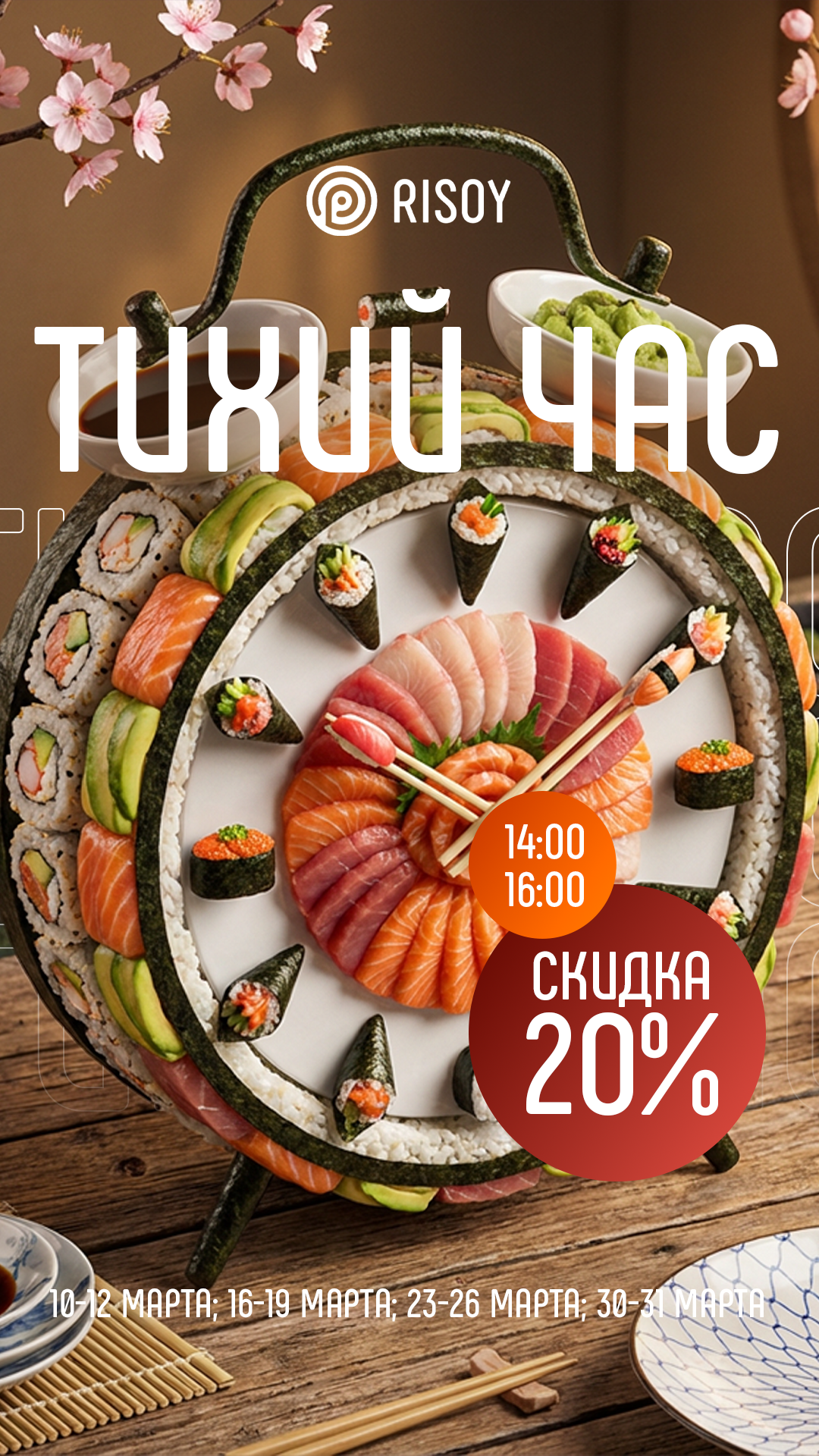 «Тихий час» в Risoy - это 20% скидка с понедельника по четверг с 14:00 до 16:00 на всё меню при заказе на самовывоз или в зале!